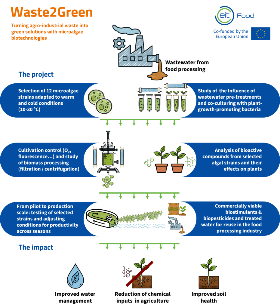 The University of Valladolid (UVa), through the Institute of Sustainable Processes (ISP), is participating as a partner in the European project Waste2Green, an initiative funded by the EIT Food Impact Funding Framework 2023–2025. The project aims to transform agri-food wastewater into sustainable solutions using microalgae.