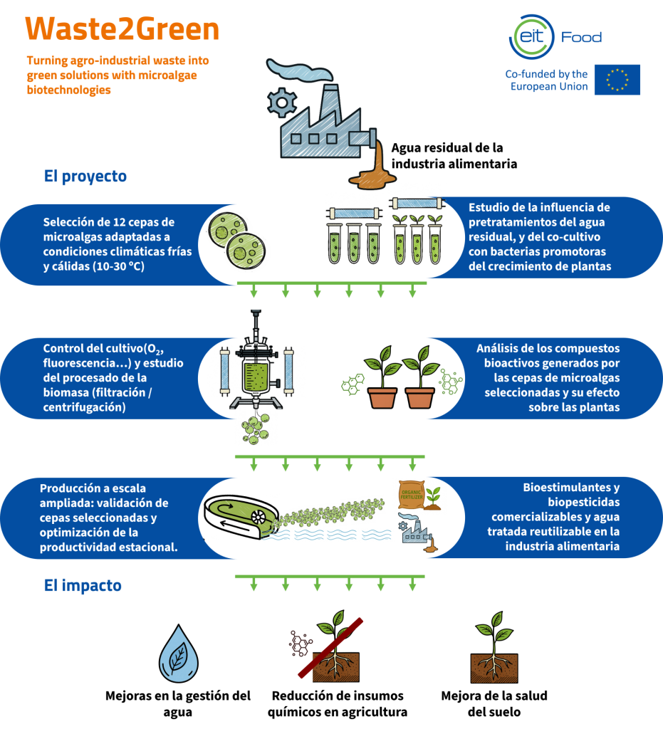 La Universidad de Valladolid (UVa), a través del Instituto de Procesos Sostenibles (ISP), participa como socio en el proyecto europeo Waste2Green, una iniciativa financiada por el EIT Food Impact Funding Framework 2023–2025 que busca transformar las aguas residuales agroalimentarias en soluciones sostenibles mediante el uso de microalgas.